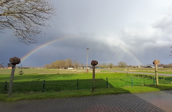 een felle zon met daarna een kort flink buitje en een regenboog.